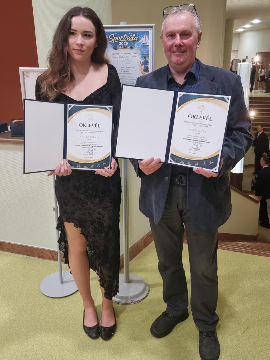Hírek Sportgála - elismerések 2026. január 27., kedd @ 22:31 A Sportgálán a Keszthely VDSE két elismerést kapott. Csahóczi Kamilla Keszthely Város Legjobb Ifjúsági leány sportolója, Csikós József Keszthely Város Legjobb Utánpótlás edzője díjban részesült. Címkék Megosztás