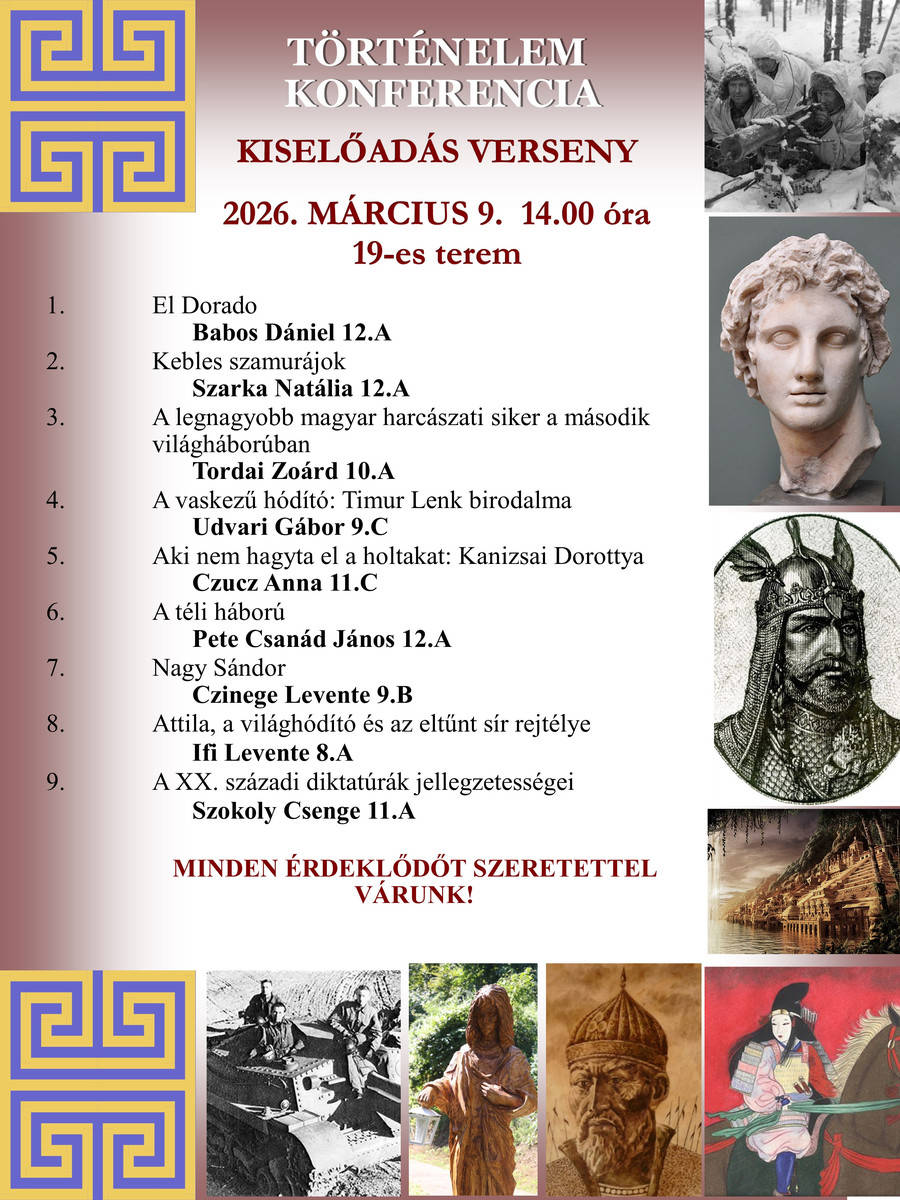 Hírek Történelem Konferencia kiselőadás verseny - 2026. 2026. március 10., kedd @ 14:38 2026. március 9-én került sor a történelem munkaközösség által szervezett Történelem Konferencia keretében a kiselőadás verseny megrendezésére. 1. helyezett: Szokoly Csenge 11.A 2. helyezett Babos Dániel 12.A 3. helyezett: Tordai Zoárd 10.A Címkék Megosztás